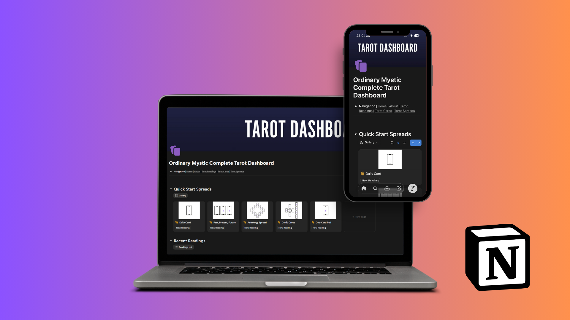 A searchable Notion template to log readings and card pulls, build a living card library, and surface past insights when you need them.